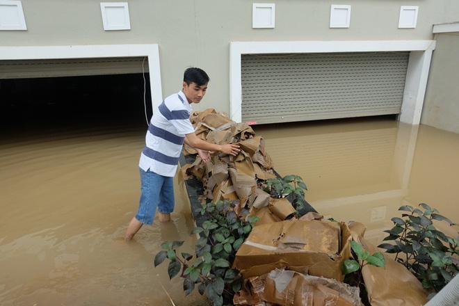 Anh Tùng cho biết, kết cấu tầng hầm của biệt thự, nước ngập sâu đến 1,5m. "Hôm qua nước ngập to quá trong khi xe máy để dưới tầng hầm. Tôi phải lao xuống để kéo xe lên. Nước ngập thế này không biết để xe máy ở đâu. Nhiều hộ dân khác cũng xoay sở đưa xe ra ngoài, bơm thoát nước", anh Tùng chia sẻ.