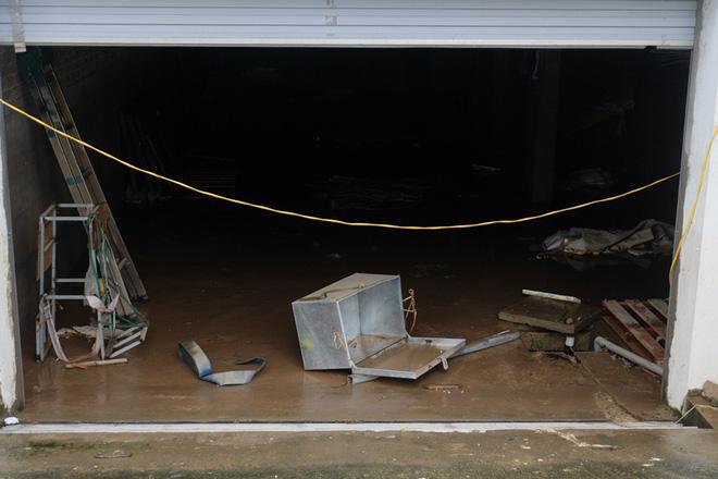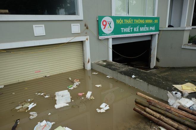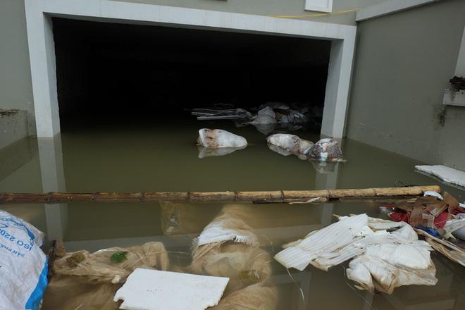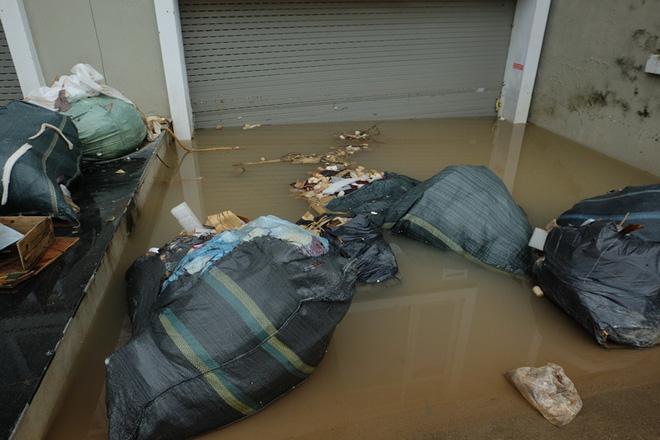 Mưa lớn khiến rác trôi nổi trước cửa tầng hầm.