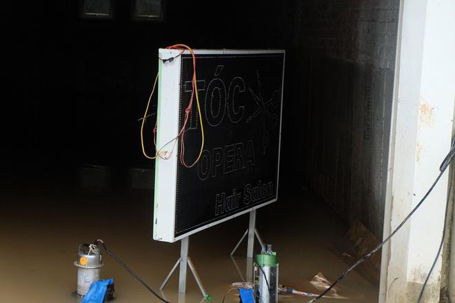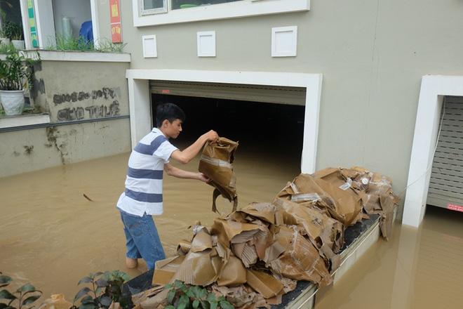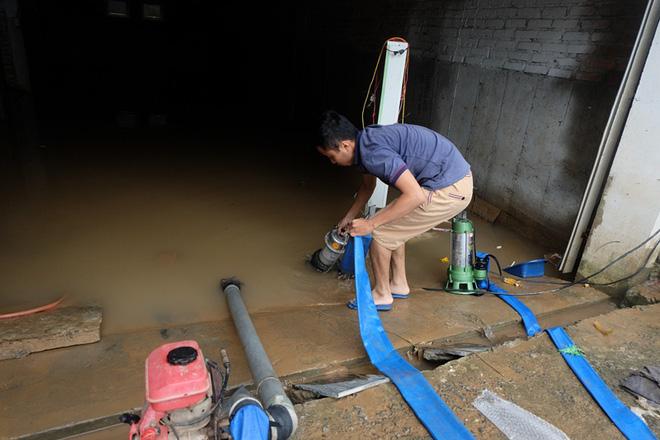 Anh Tùng cho biết, kết cấu tầng hầm của biệt thự, nước ngập sâu đến 1,5m. "Hôm qua nước ngập to quá trong khi xe máy để dưới tầng hầm. Tôi phải lao xuống để kéo xe lên. Nước ngập thế này không biết để xe máy ở đâu. Nhiều hộ dân khác cũng xoay sở đưa xe ra ngoài, bơm thoát nước", anh Tùng chia sẻ.