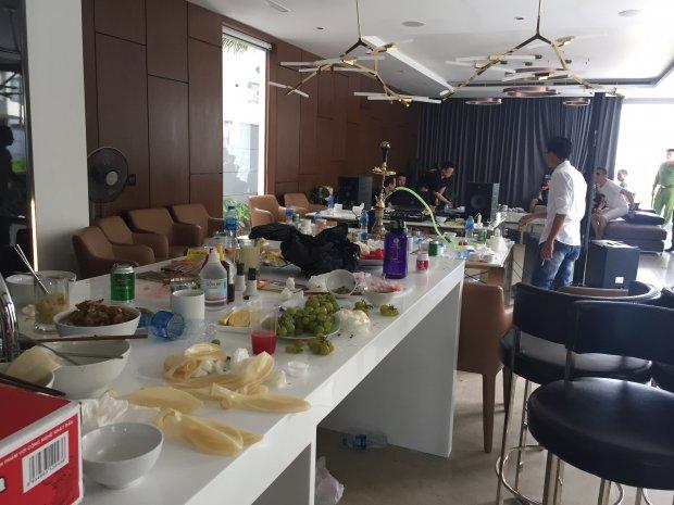 Tại hiện trường, lực lượng làm nhiệm vụ phát hiện 1 đĩa sứ chứa chất bột trắng (ketamine), hàng chục chiếc bóng cười, dụng cụ sử dụng cần sa, shisa cùng nhiều đồ ăn, thức uống, vật dụng cá nhân vương vãi khắp nơi…