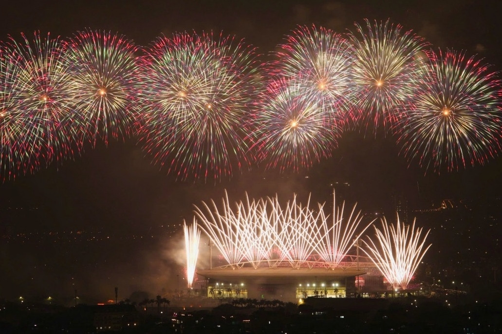 Trước đó, khu vực phía trước sân vận động quốc gia Mỹ Đình được phong tỏa nghiêm ngặt. Bên trong hàng rào an ninh nhiều lớp, trận địa pháo hoa lớn nhất từ trước đến nay của Hà Nội đã hoàn tất lắp đặt, sẵn sàng khai hỏa phục vụ chương trình nghệ thuật đặc biệt diễn ra tối nay.