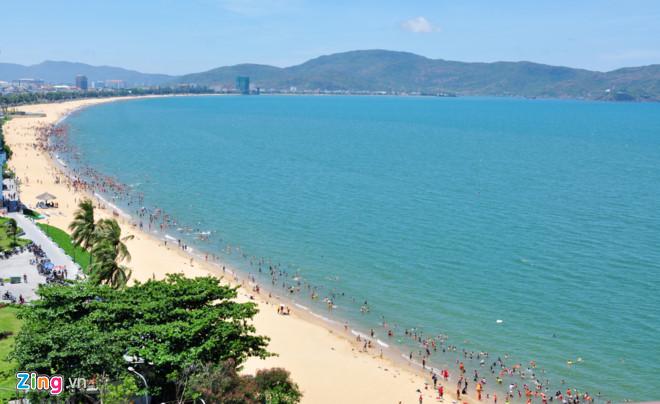 Bãi biển Quy Nhơn uốn cong "vầng trăng khuyết" đông người, khác với các buổi trưa bình thường. Ảnh: Minh Hoàng.