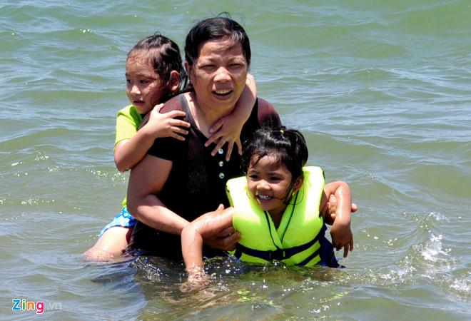 Người lớn, trẻ em vô tư nô đùa trong làn nước biển xanh trong. Nhiều người còn mang cả chiếc dù che nắng cho con, cháu tắm.