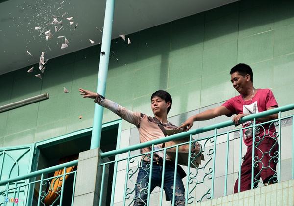 Làm lễ xong, anh Thuận mang các thùng tiền lên tầng 2 của cửa hàng ném xuống.