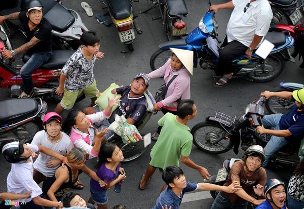 Người già, thanh niên, trẻ nhỏ lao tới tranh nhau những tờ tiền lẻ rơi xuống đất.