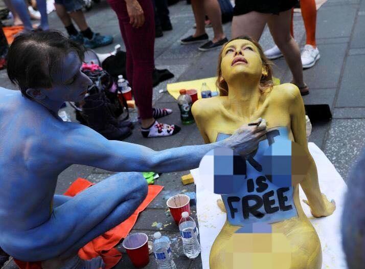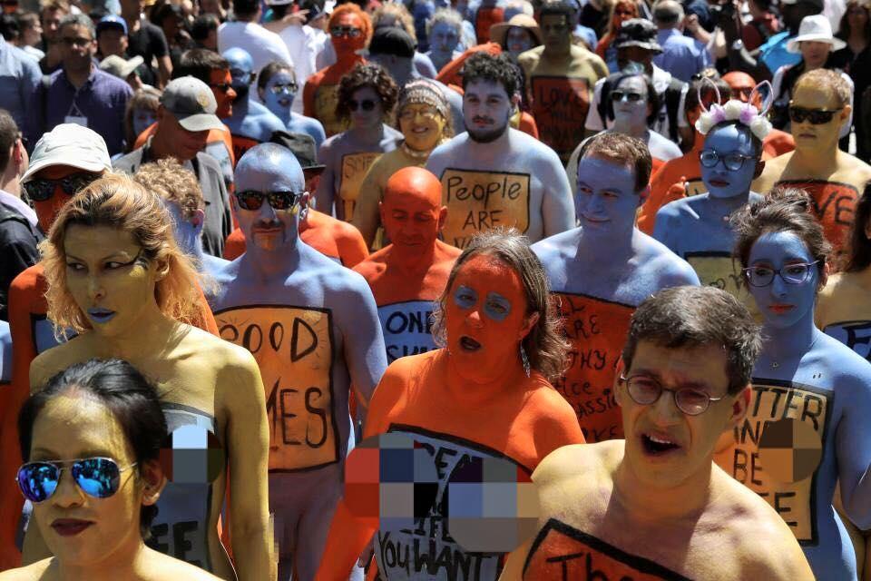 Những người mẫu khỏa thân tham gia sự kiện được sơn màu xanh và vàng trước mặt du khách tò mò và cảnh sát vũ trang. Nhiều người vẽ thông điệp lên người như “Đón chào tình yêu và cuộc sống”, “Sinh ra khỏa thân”.