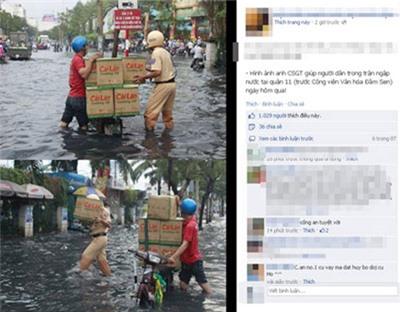 Bức ảnh ghi lại cảnh một chiến sĩ CSGT giúp người dân chở nhiều thùng hàng khi xe bị chết giữa biển nước được cư dân mạng chia sẻ với tốc độ chóng mặt. Lúc vừa xuất hiện trên một fanpage với tiêu đề “Hình ảnh anh CSGT giúp đỡ dân trong ngập nước tại Q.11 (trước Công viên Văn hóa Đầm Sen)”, bức ảnh đã nhận được rất nhiều "like" và phản hồi.