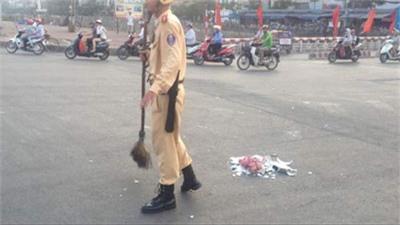 Chiều 20/5, nhiều người đi đường qua khu vực ngã tư Cầu Giấy, Hà Nội chứng kiến hình ảnh một cảnh sát giao thông cầm chổi quét những mảnh sứ vụn vỡ văng tung tóe trên đường dưới trời nắng nóng. Hình ảnh đẹp này đã gây được ấn tượng tốt từ nhiều người đi đường.