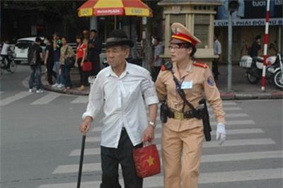 Trung úy Hoàng Thị Cẩm Vân ân cần dắt cụ già qua đường.