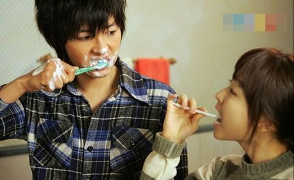 Chàng và nàng cùng đánh răng thật vui vẻ bên nhau.