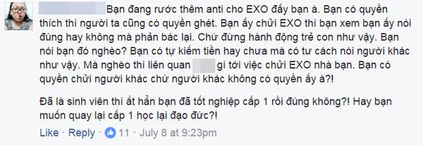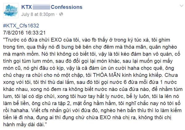 Kết confession, không dừng lại ở việc đe dọa những người dám động chạm đến thần tượng của mình, người viết confession còn bày tỏ suy nghĩ lệch lạc của mình khiến dân mạng phẫn nộ: "Viết confessions nhắn gửi với đứa đói nghèo hèn bẩn thỉu thì lo làm thêm kiếm tiền lẻ đi nha, đụng ai thì đụng chứ chừa EXO nhà chị ra, không thôi chị hành mày dài dài".