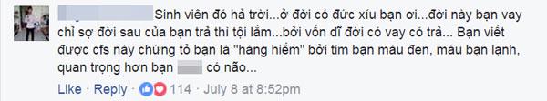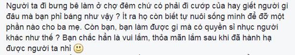 "Người ta đi bưng bê làm ở chợ đêm chứ có đi cướp của hay giết người gì đâu mà bạn phỉ báng như vậy? Ít ra họ còn biết tự nuôi sống mình để đỡ một phần cho ba mẹ. Còn bạn, bạn làm được gì mà có quyền sỉ nhục người khác như thế? Bạn chắc hẳn vui lắm, thỏa mãn lắm sau khi đã hành hạ được người khác nhỉ?"