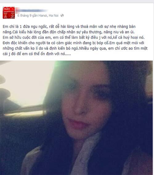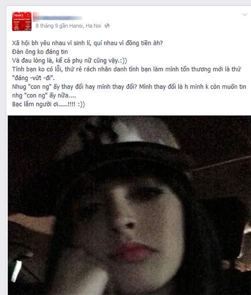 Trên trang cá nhân của cô người mẫu Tây cũng rất tâm trạng mất niềm tin vào đàn ông, "Xã hội bây giờ yêu nhau vì sinh lí, quý nhau vì đồng tiền à? Đàn ông không đáng tin. Bạc lắm người ơi".