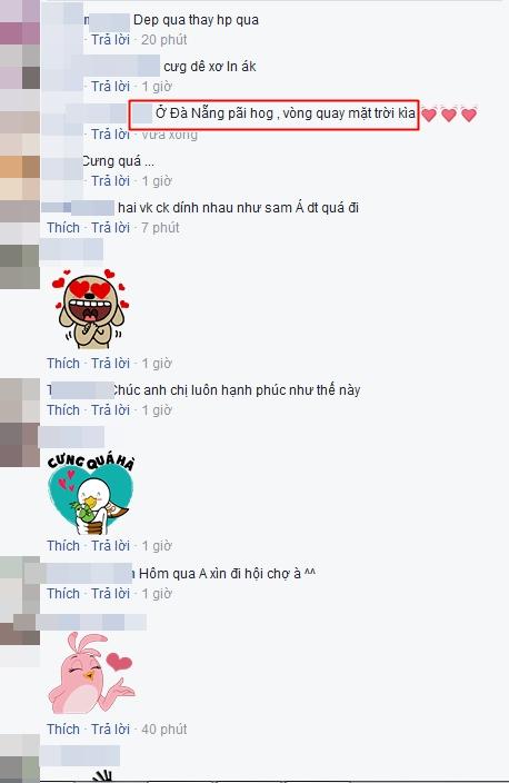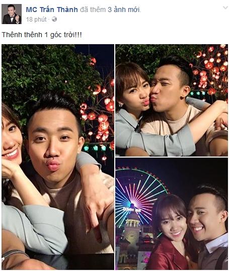 Trong khi, bà xã Hari Won đăng trạng thái đầy tâm trạng thì Trấn Thành lại ngược hoàn toàn khi khoe khoảnh khắc tinh nghịch vui vẻ của hai vợ chồng với cảm xúc đầy hào hứng: Thênh thênh một góc trời. Nếu như, bà xã Hari Won nhận được vô số lời an ủi thì Trấn Thành lại nhận mưa lời khen tung hô từ người hâm mộ. Có fan còn dự đoán đây là hình ảnh cặp đôi ghi lại ở vòng quay mặt trời tại Đà Nẵng.