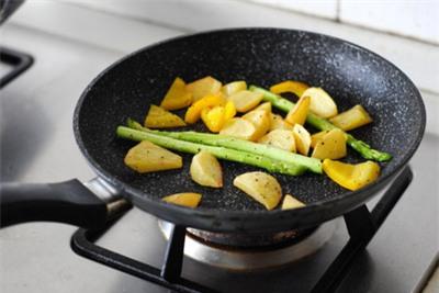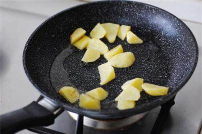 Khoai tây rửa sạch, gọt vỏ và cắt khúc vừa ăn. Bắc chảo lên bếp cùng chút dầu, sau đó cho khoai tây vào áp chảo cho đến khi vàng nâu hai mặt.