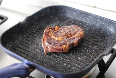 Bắc chảo đế dày lên bếp, khi chảo nóng đều thì cho thịt bò vào nướng. Sau một phút thì lật mặt, nướng thêm 5 phút nữa thì lấy ra khỏi chảo. Thời gian nướng có thể giảm hoặc tăng tùy vào độ dày của miếng thịt nhé!