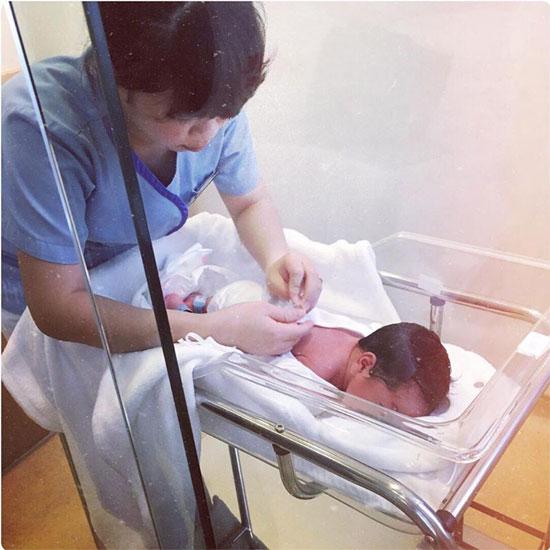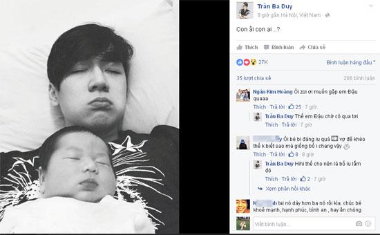 Sau khi Nam Thương đăng tải hình ảnh của bé Đậu lúc được y tá cho đi tắm thì đêm qua Ba Duy cũng vui vẻ chia sẻ hình ảnh cực đáng yêu, bụ bẫm và giống bố như đúc của bé Đậu. Đây là hình ảnh rõ mặt đầu tiên của bé. Anh chàng hot boy "đẹp trai thì có nhiều đứa yêu" cũng hài hước viết status cho ảnh của mình và con trai: "Con ải con ai?"