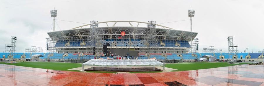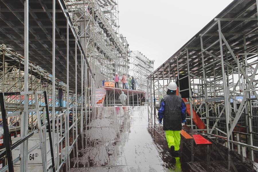 Hơn 100 tấn giàn giáo được sử dụng phục vụ cho việc thi công, dù trời đang mưa lạnh nhưng cả ekip vẫn đang gấp rút vận chuyển những thùng trang thiết bị nặng gần 1 tấn lên sân khấu.