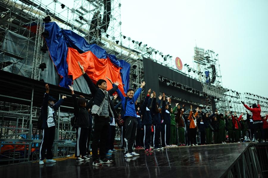Các vũ công, diễn viên quần chúng không quản ngại trời mưa rét.
