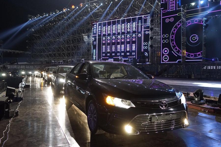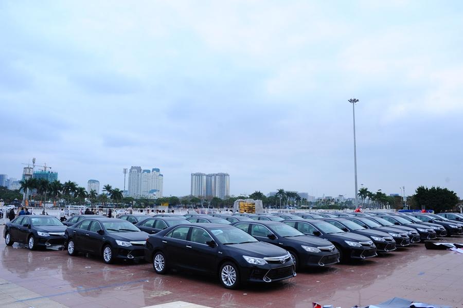 50 chiếc Camry đỗ phía ngoài sân vận động để chờ tổng duyệt. Đây sẽ là phần thưởng tri ân dành cho những khách hàng may mắn của tập đoàn Vingroup. Tổng giá trị giải thưởng của chương trình lên đến 100 tỷ đồng.