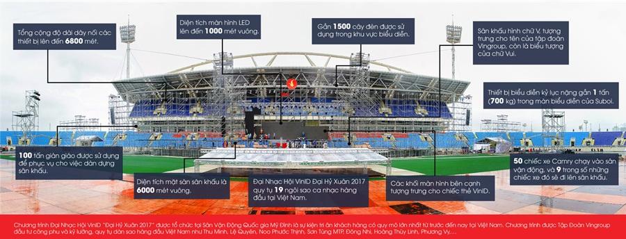 Màn hình Led rộng gần 1.000m2, 1.500 chiếc đèn chiếu sáng được đặt khắp sân vận động, 400 diễn viên quần chúng, 50 chiếc xe Camry tham gia tổng duyệt… những mảnh ghép ấn tượng của sân khấu Đại nhạc hội VinID Đại Hỷ Xuân đang dần được hé lộ.