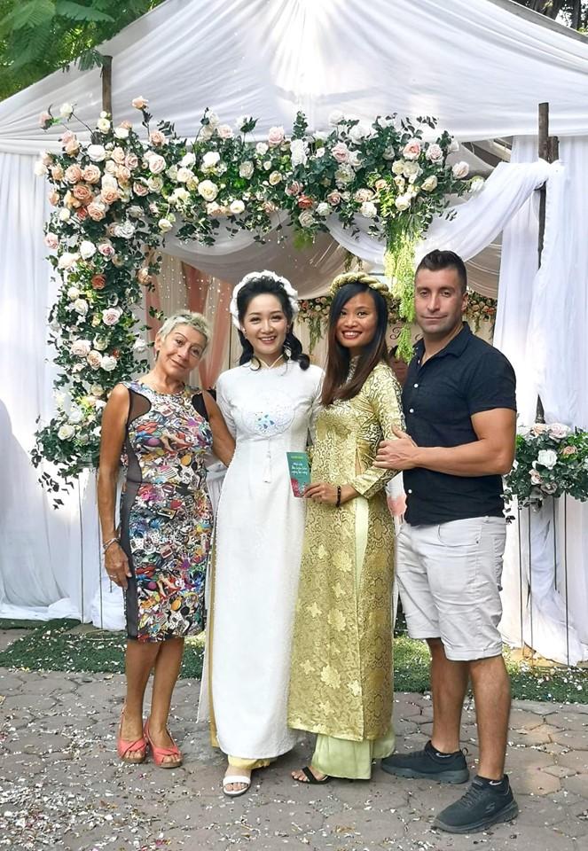 Trong ngày quan trọng, 8X diện áo dài trắng, đầu đội khăn vấn và nở nụ cười rạng rỡ bên người thân quen.