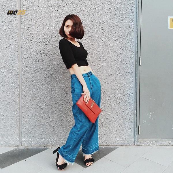 Phần áo bó ở trên cùng với chiếc quần bò ống rộng vừa giúp cho các nàng tôn dáng mà lại che được những khuyết điểm như vai ngang hay cặp đùi thô.