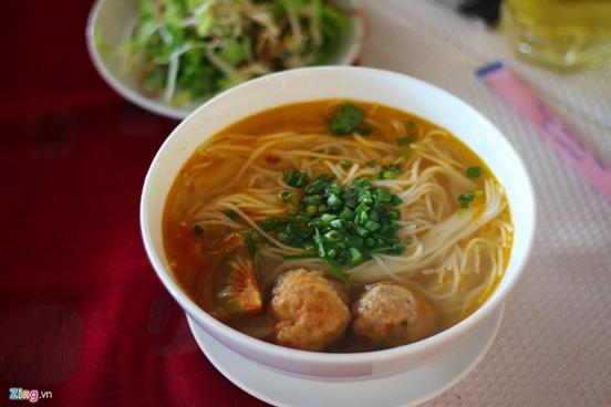 Món ăn được dọn kèm đĩa rau sống cắt nhuyễn và chén mắm mặn ớt xắt. Bún cá có giá 20.000 đồng