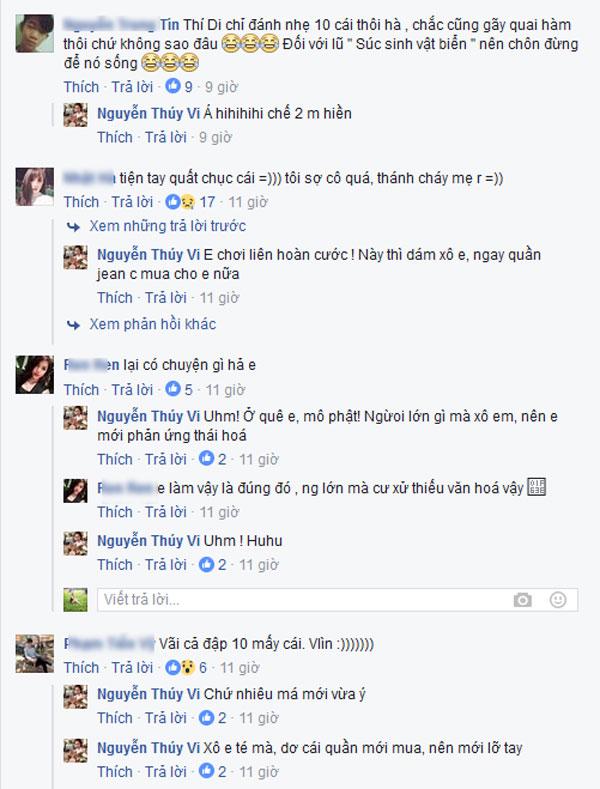 Mình chỉ muốn nói là mình phòng thân chứ không đánh ai cả và nếu là các bạn thì cũng làm thế thôi! Còn các bạn biến tấu câu chuyện như thế nào thì tùy. Tóm lại là do mình bị bệnh khó ưa và mình chỉ mắc cười là kiếm chuyện với người khác mà bị người ta đánh chảy máu mồm thôi. Biết là đánh cái người đáng tuổi cha tuổi mẹ mình là sai đó, thì mình cũng cảm ơn cái nón bảo hiểm, không nhờ nó là hư bộ móng tay mới sơn gel. Thế thôi mình tự vệ do bị xô ngã chứ không đánh người. Xin lỗi Thúy Vi vì hôm nay cho bản thân cư xử thiếu đẳng cấp và hơn hết cảm thông cho cái sự khó ăn khó ở của mình. Hãy thông cảm cho chứng bệnh coi bản thân là nhất của cô gái này."