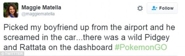 “Ra sân bay đón bạn trai và anh ta bắt đầu hét lên trong xe… vì phát hiện một con Pidgey và một con Ratata hoang dã trên bảng đồng hồ”.