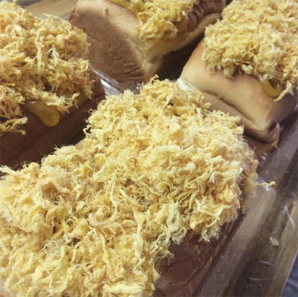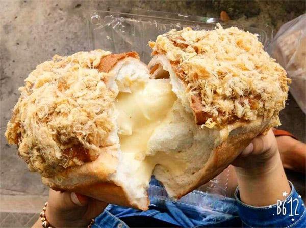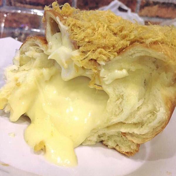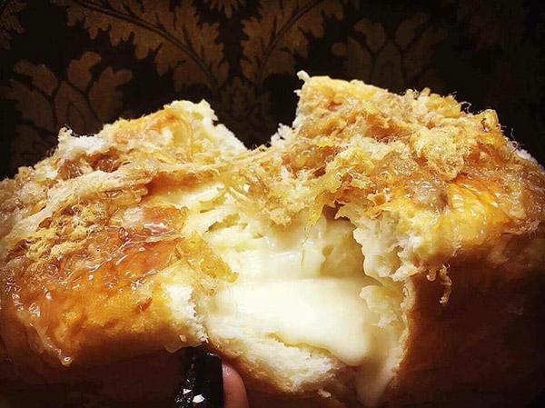 Món ăn có nguyên liệu là vỏ bánh mì thơm mùi bơ sữa, nhân làm từ kem phô mai chảy và bề mặt phủ chà bông (ruốc). Ảnh: Minh.candy