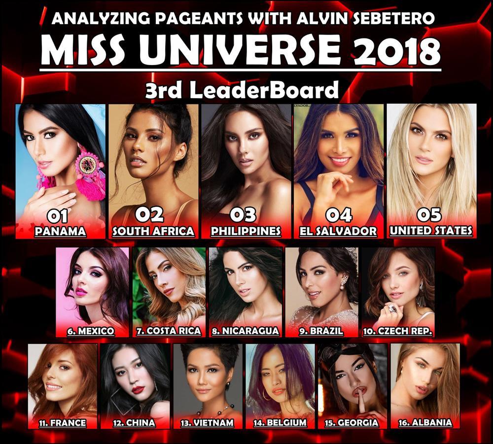 Ở bảng xếp hạng đầu tiên, Alvin Sebetero xếp H'Hen Niê ở vị trí thứ 4. Đây là thời điểm những nhan sắc đầu tiên tại Miss Universe 2018 lộ diện.