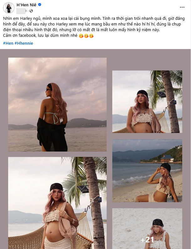 Cô viết: "Nhìn em Harley ngủ, mình xoa xoa lại cái bụng mình. Tính ra thời gian trôi nhanh quá đi, giờ đăng hình để đây, để sau này cho Harley xem mẹ lúc mang bầu em như thế nào hí hí hí, đúng là chụp điện thoại nhiều hình thật đó, nhưng lỡ có mất điện thoại là mất luôn mấy hình kỷ niệm này. Cảm ơn Facebook, lưu lại dùm mình nhé."