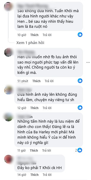 Một số comment từ dân mạng: "Sao không đưa hình Tuấn Khôi mà đưa hình người khác vậy", "Những tấm hình này để lưu lại cho con thấy, đáng lẽ phải để hình của ba Harley mới phải"...