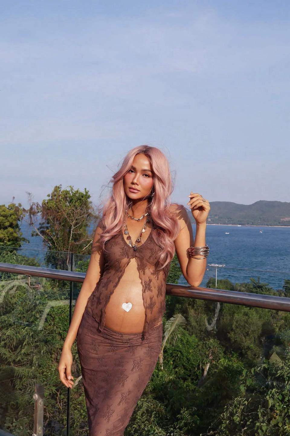 Trong hình, bà xã Tuấn Khôi tự tin diện trang phục xuyên thấu khoe bụng to vượt mặt. Người đẹp chọn layout trang điểm nhẹ nhàng với mái tóc tẩy màu hồng nhạt trông cực kì slay. Thần thái, nhan sắc lẫn vóc dáng của mẹ bầu không thay đổi gì nhiều ngoài chiếc bụng nhô cao.