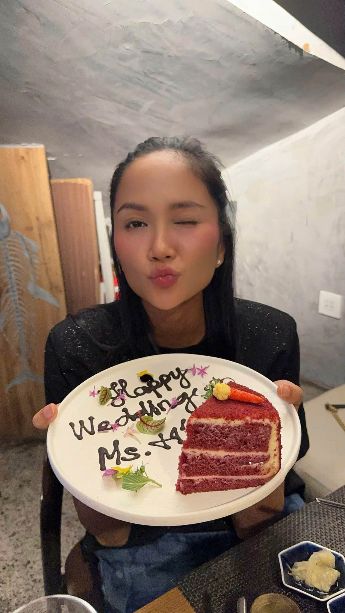 Nàng hậu viết: "Nhẹ nhàng tiệc chia tay độc thân". Bên cạnh H'Hen Niê là Á hậu Lệ Hằng, Á hậu Thủy Tiên, Á hậu Kim Duyên, đây đều là những người bạn thân thiết của cô.