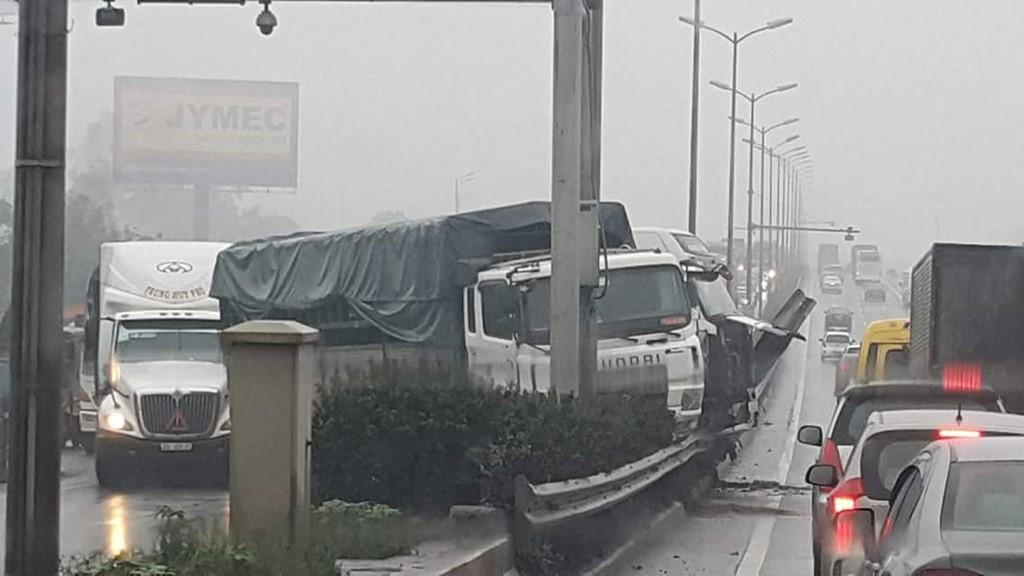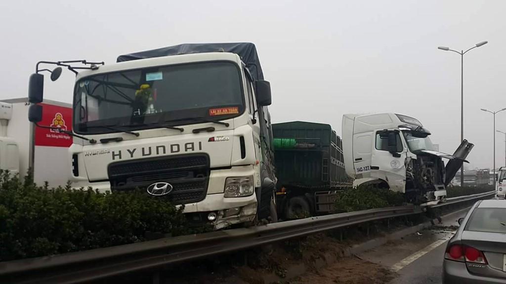 Tai nạn liên hoàn xảy ra vào khoảng 6h sáng 18/3 tại chân cầu Thanh Trì hướng sang Gia Lâm (Hà Nội). Hiện trường có 3 chiếc xe tải quay ngang đường.