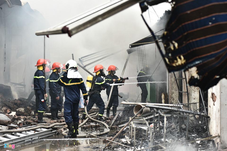 Lúc 14h20, lửa vẫn cháy hừng hực ở nhiều gian hàng. Lúc này cứu hoả chưa kịp tiến sâu vào trong hiện trường.
