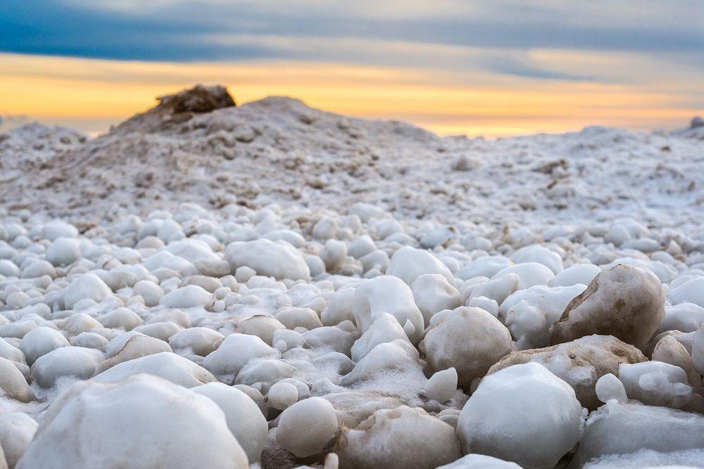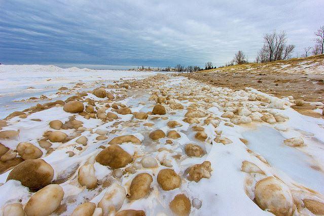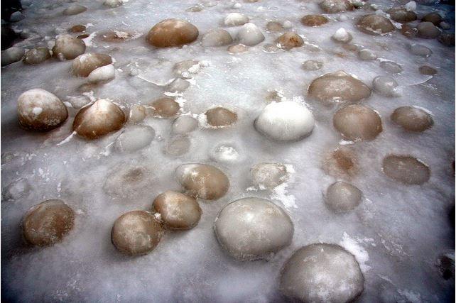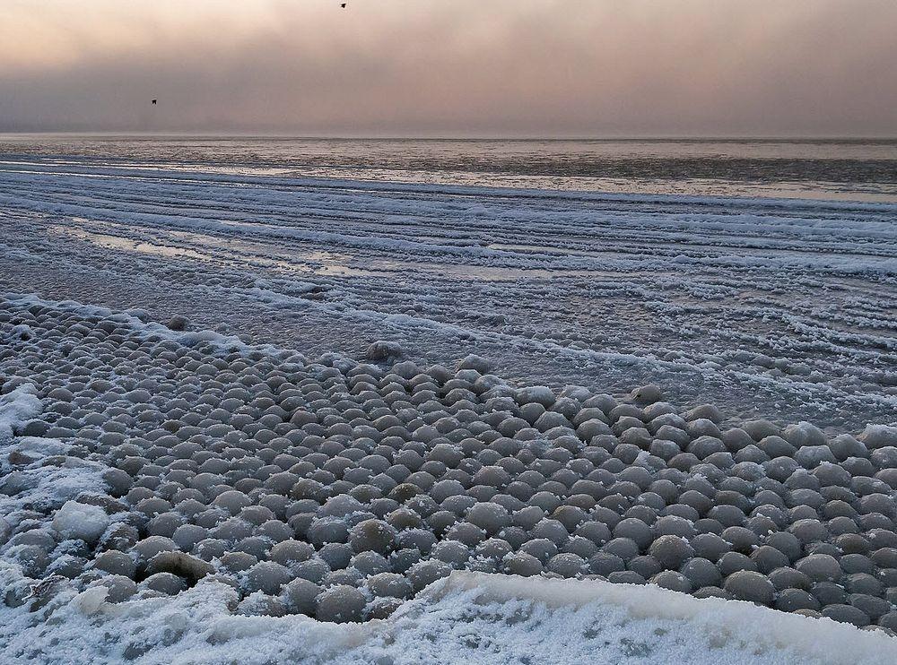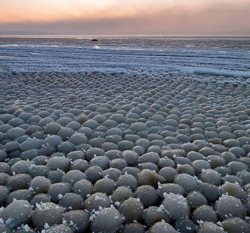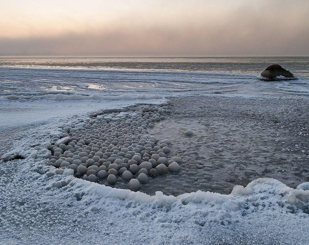 Cứ vào mùa đông, xung quanh bãi biển Stroomi ở phía bắc Tallinn (Estonia) hay trên bờ Hồ Michigan, một trong 5 hồ lớn của Mỹ, hàng trăm những trái bóng làm từ băng được hình thành tự nhiên nằm san sát nhau. Đường kính những quả bóng này có thể dao động từ 7 – 10 cm cho đến hơn 30 cm.