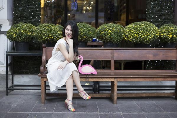 Cô nàng thanh lịch và tinh khôi trong bộ đầm trắng dài với thắt lưng yểu điệu. Điểm nhấn là chiếc túi hình hồng hạc của thương hiệu Moschino.