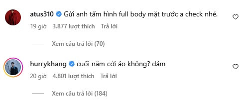 Dưới bài đăng của Hieuthuhai, nhiều người dành lời khen có cánh cho nam rapper. Trong đó, Anh Tú Atus cũng lên tiếng: "Gửi anh tấm hình full body mặt trước anh check nhé". HurryKng thách thức: "Cuối năm cởi áo không?"