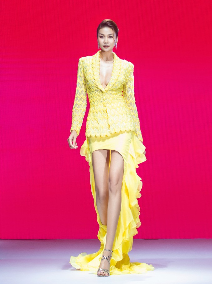 Thanh Hằng ghi điểm tuyệt đối với thiết kế đầm màu vàng highlow khi xuất hiện trong sự kiện Vietnam's Next Top Model. Nữ siêu mẫu khoe trọn đôi chân dài hơn 1m trứ danh thu hút mọi ánh nhìn.