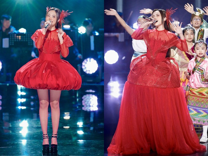 Xuất hiện trên sân khấu chung kết Sing! Asia 2025, Phương Mỹ Chi không chỉ ghi điểm bởi giọng hát "cá heo" cao chót vót mà còn nhờ màn biến hóa trang phục vô cùng bắt mắt. Nữ ca sĩ diện chiếc đầm phồng ngắn biến hóa thành dài tựa đầm dạ hội tạo điểm nhấn đặc sắc trên sân khấu. Nhà thiết kế Nguyễn Minh Công cho biết trang phục được thiết kế với thân trên là áo bà ba cách điệu, thân váy phom dáng "lồng gà" lồng ghép yếu tố văn hóa làng quê dân dã của Việt Nam.