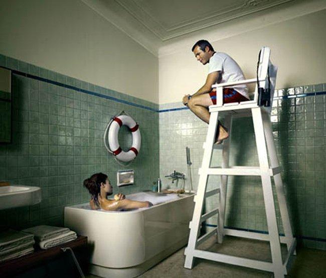 Đi tắm mà còn phải có người "giám sát" nữa cơ.