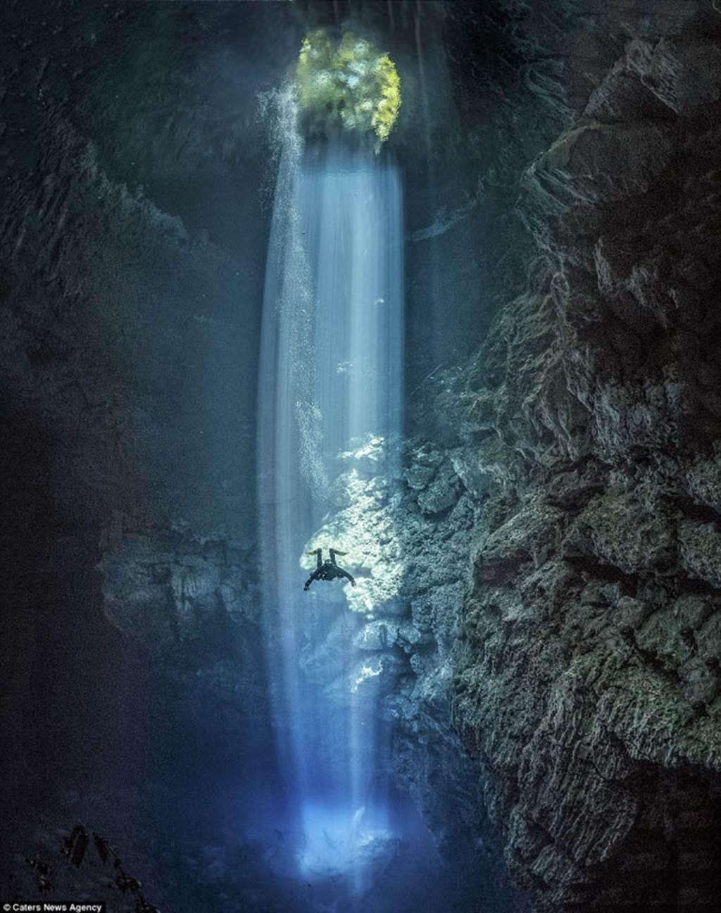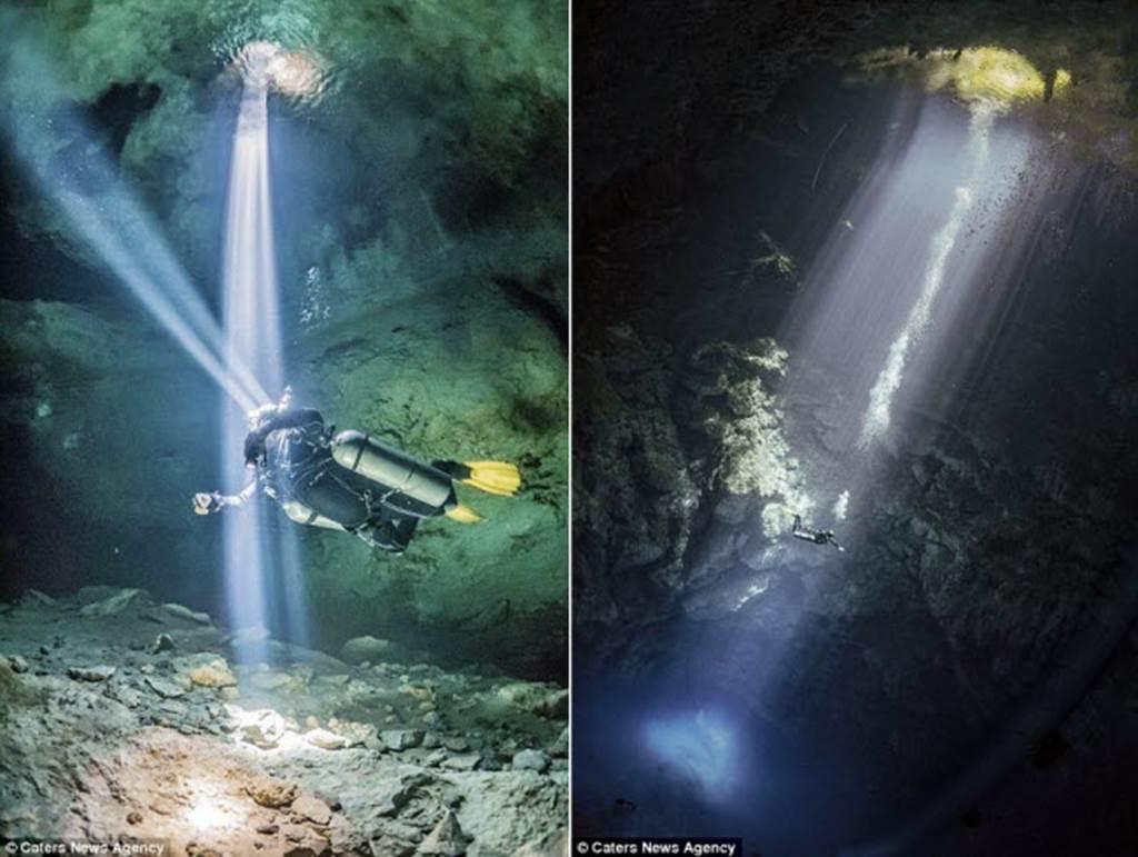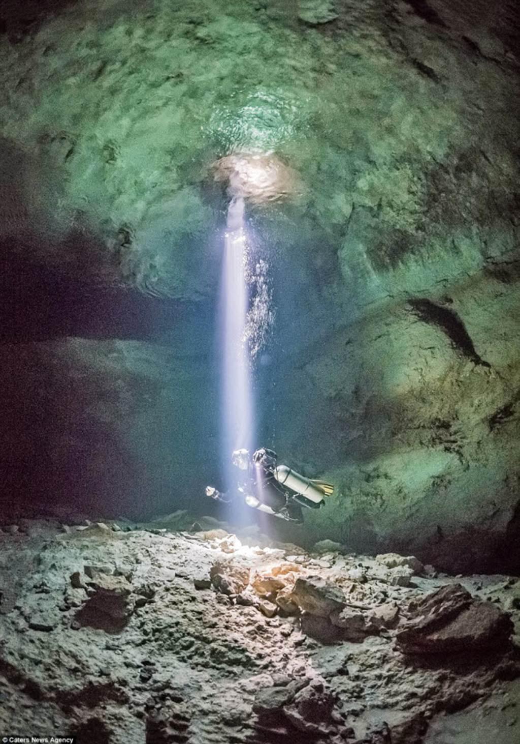 Một hang động khổng lồ được chiếu sáng bằng những tia sáng mặt trời khi các thợ lặn khám phá thành hang và cấu trúc đá.