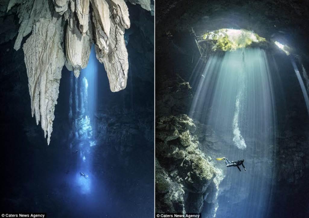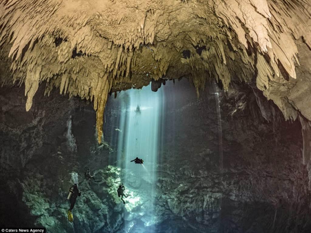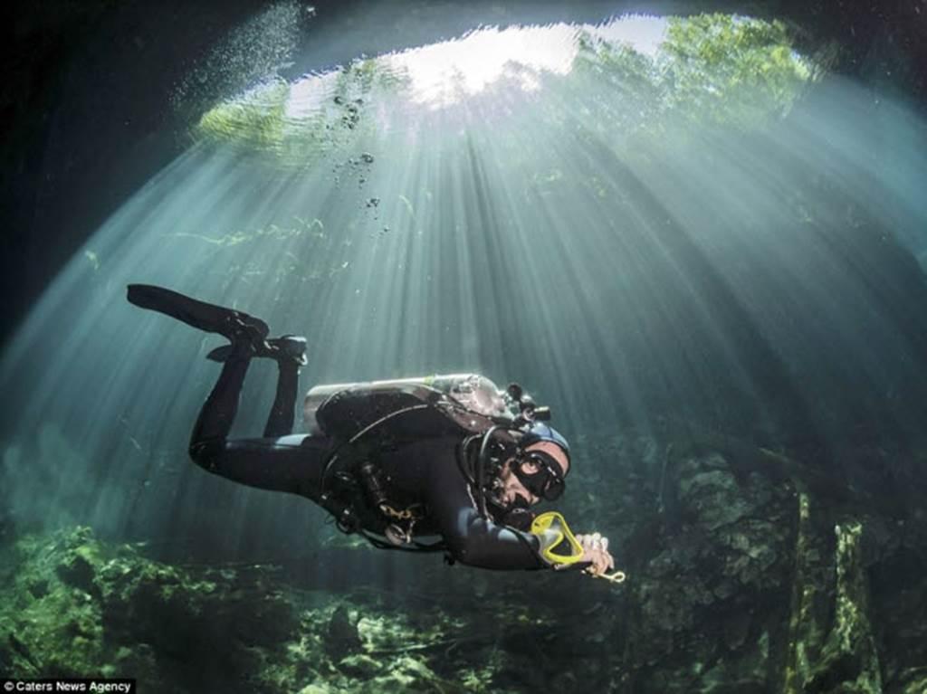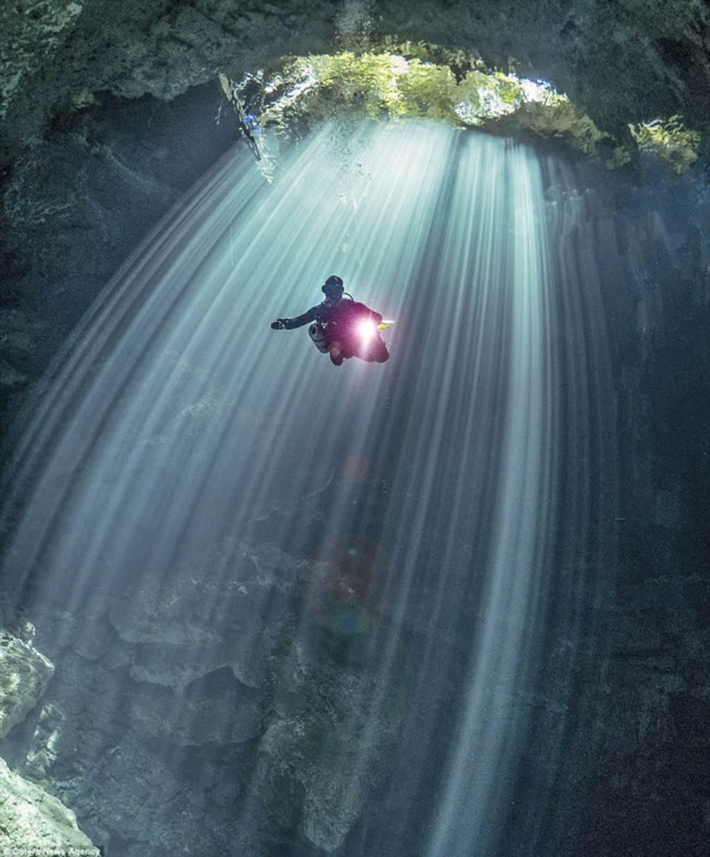 Ánh sáng mặt trời giúp các thợ lặn khám phá những hang động và đường hầm ngầm dưới nước trên hòn đảo Isla Mujeres ở ngoài khơi thành phố Cancun, Mexico.