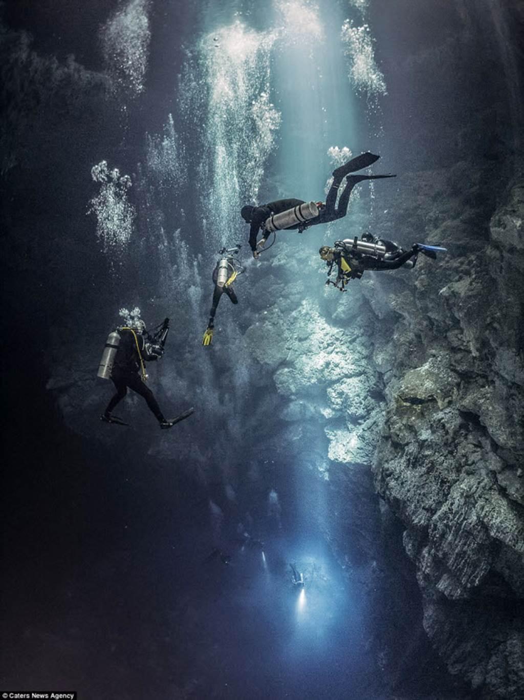 Nhóm 4 thợ lặn tận dụng ánh sáng tự nhiên từ trên mặt nước để khám phá hang động ngầm.