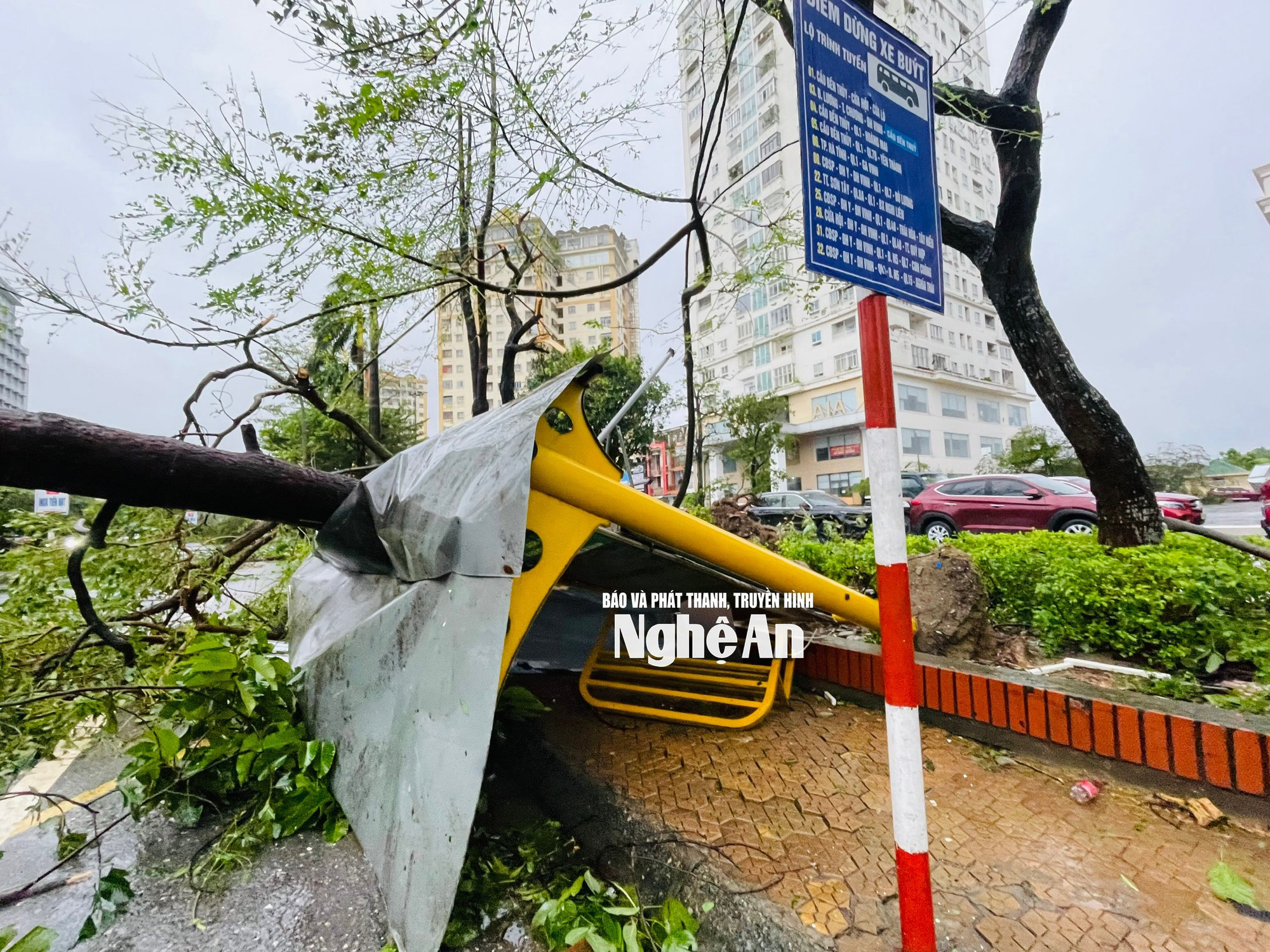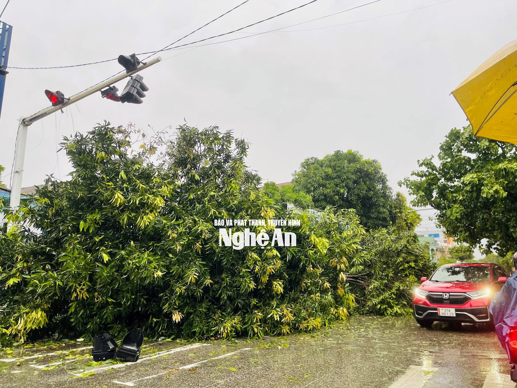 Sau hơn 5 giờ quần thảo, bão số 5 đã để lại hậu quả nặng nề tại nhiều địa phương ở Nghệ An. Mưa gió dữ dội kèm theo lốc xoáy khiến hàng loạt cây xanh bật gốc, nhiều mái nhà, công trình công cộng bị tốc mái, sập đổ, giao thông ách tắc cục bộ.