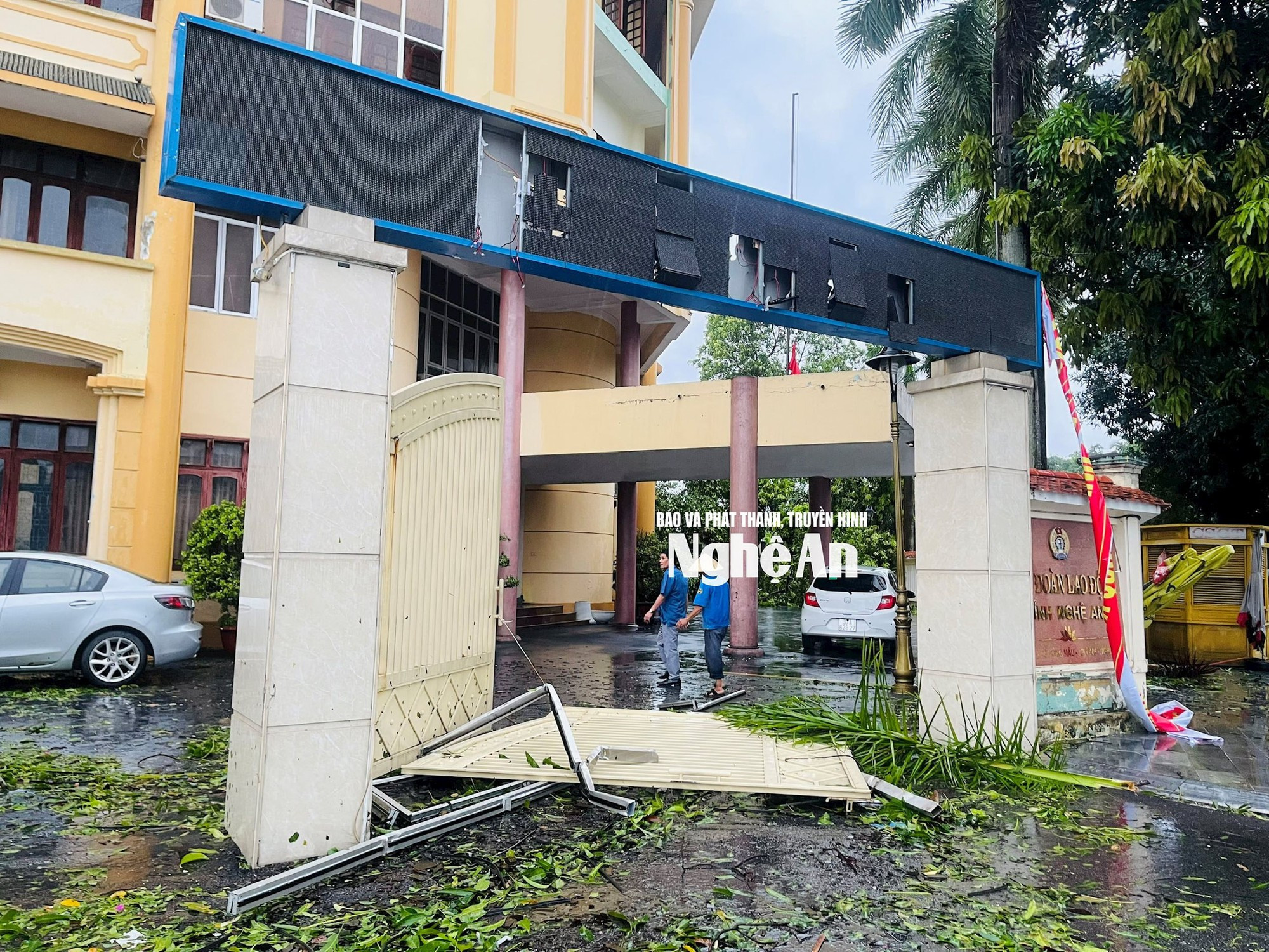 Cổng Liên đoàn Lao động tỉnh Nghệ An gãy đổ. Ảnh: Quang An