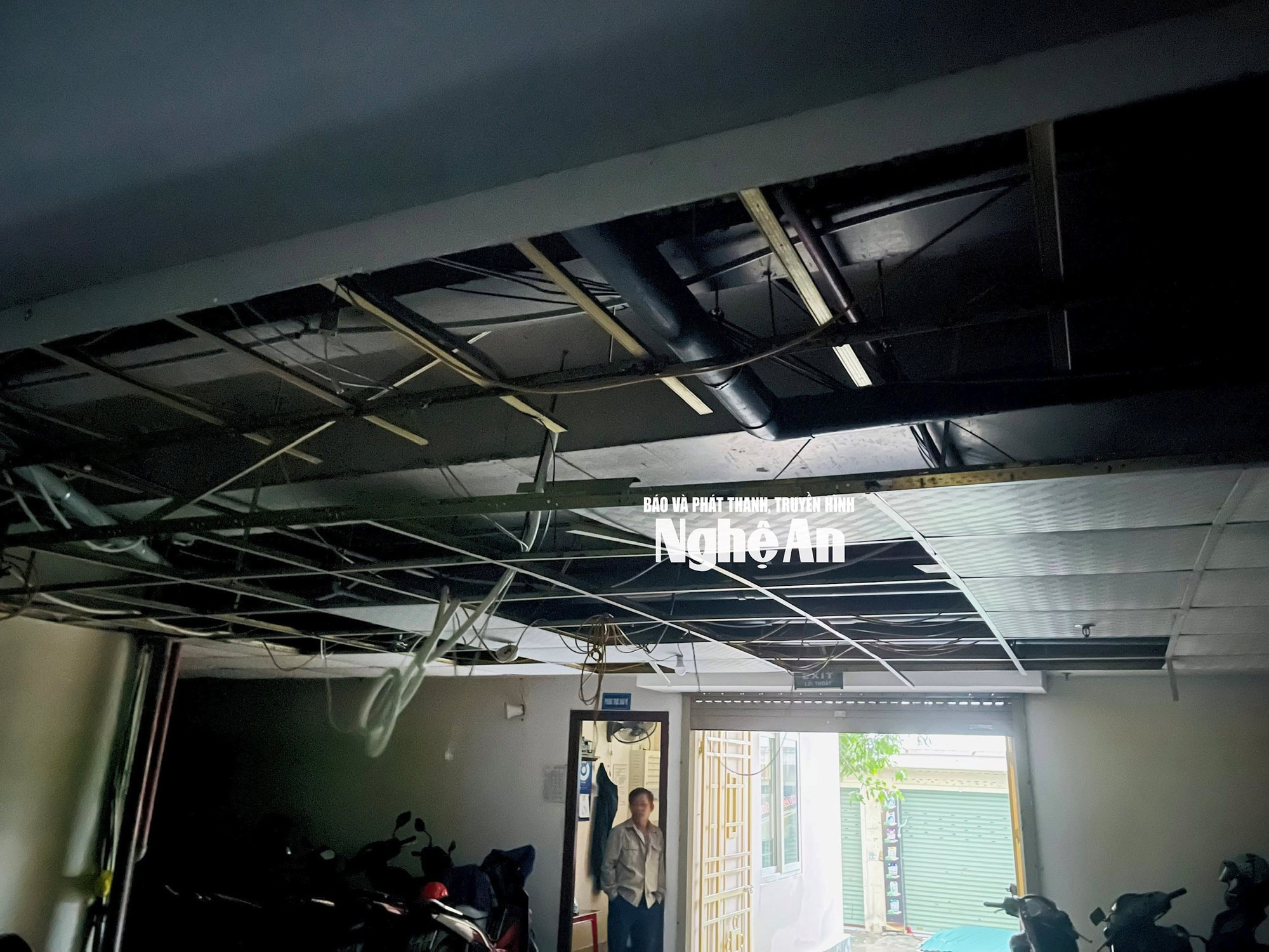 Từ những hình ảnh chia sẻ tại Bệnh viện Sản Nhi Nghệ An, sức gió dữ dội đã khiến nhiều khu vực bị phá huỷ nghiêm trọng. Hành lang bệnh viện ngổn ngang mảnh vỡ, tấm tôn, trần nhà rơi xuống nền nhà, nước mưa tràn vào gây ẩm ướt khắp nơi.
